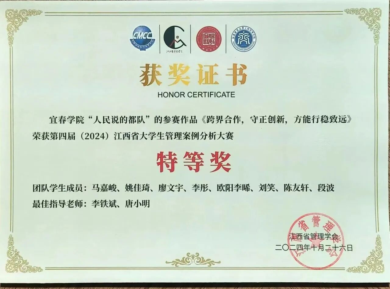 学院倡导以竞赛融合科教,提升学生综合素养与就业创业能力。近三年,学院学生参加省级以上学科赛事280 余项,获奖近300余项,获奖人次达1100余次,参与学生 780余人。尤其是2024年在江西省大学生管理案例分析大赛中斩获全省本科组唯一一项特等奖,充分彰显了学院人才培养的扎实成效。
