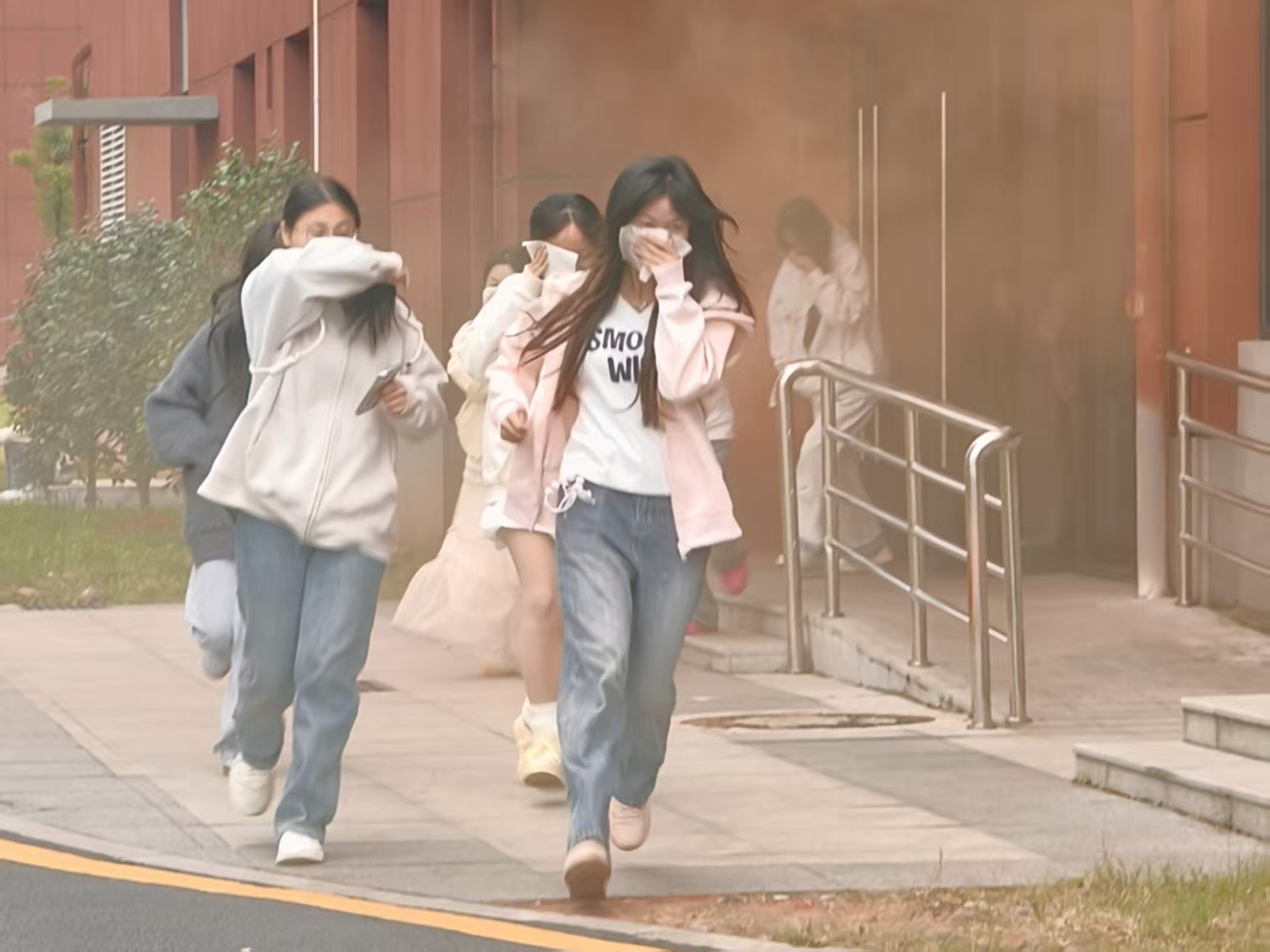 呜——随着尖锐的警报声划破校园,宿舍模拟火情突发,楼道内迅速弥漫起模拟烟雾。学生们立即进入应急状态:快速用湿毛巾捂住口鼻,弯腰低姿,沿墙壁摸索前行,严格遵循疏散标识向安全区域撤离,整个过程紧张有序。在辅导员的引导下,学生们迅速集合至篮球场。疏散集结后,邵南岗老师就此次演练进行了总结。他肯定了学生们在疏散演练中的快速反应与有序配合,同时强调同学们应注重消防安全,时刻绷紧安全之弦,共同守护校园安全。