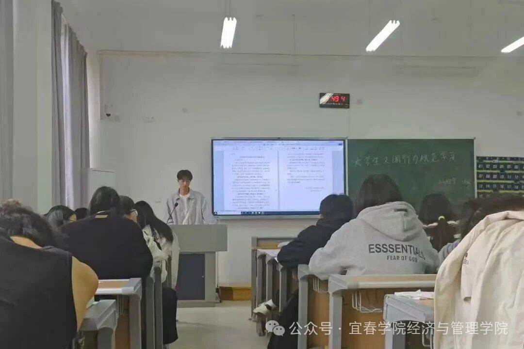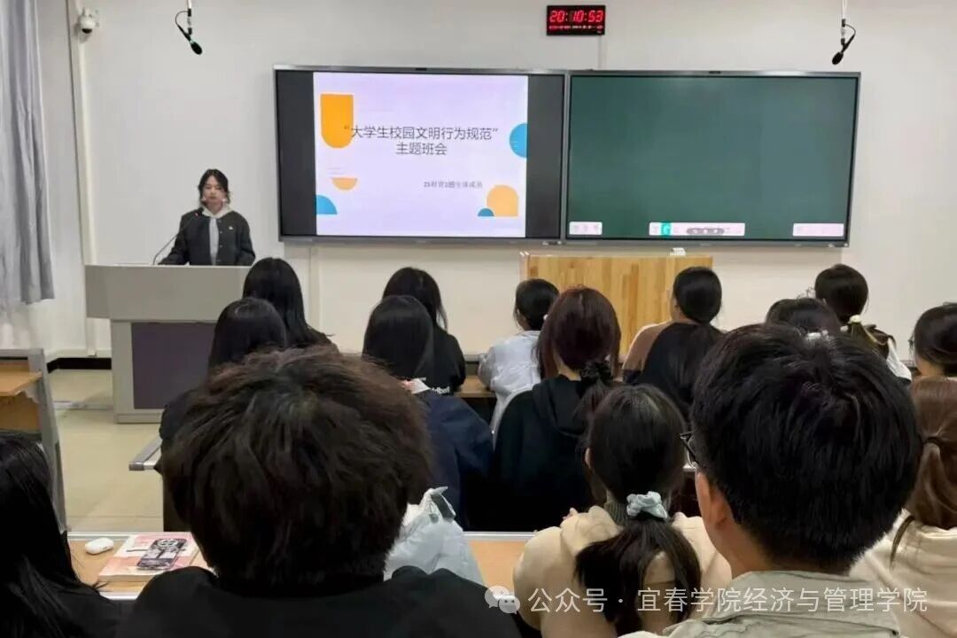 2在大学生行为规范专题学习环节,各班通过召开主题班会,扎实开展规范教育。班团干部带头组织同学认真学习《宜春学院大学生校园文明行为规范倡议书》《宜春学院大学生校园行为规范自律承诺书》及《学生手册》中有关宿舍管理的相关规定。学习结束后,同学们郑重签署《承诺书》,承诺将文明规范内化于心、外化于行。寝室作为文明创建的重要阵地,我院同步开展了以“文明安全、整洁节能”为主题的示范行动,各寝室积极响应参与。同学们集中观看宿舍安全文明知识视频,重点学习用电安全、消防隐患识别等内容,从实处提升自我管理能力与安全防范意识。