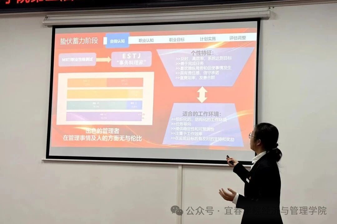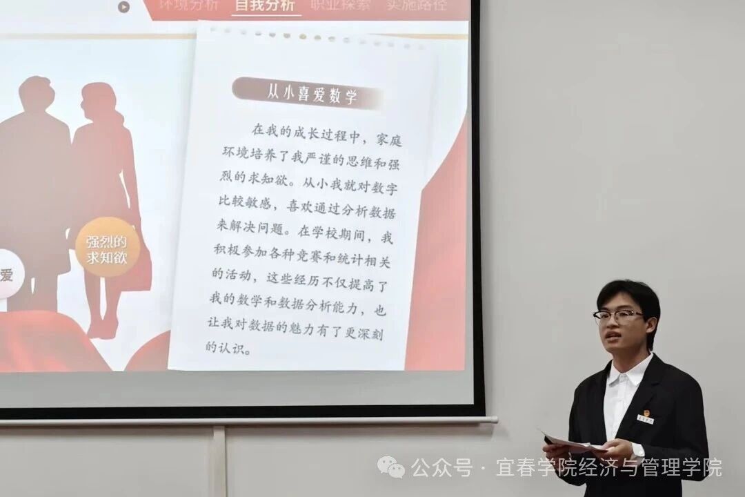 比赛现场,各年级参赛选手依次登台展示,围绕自我认知、职业探索、目标定位与实施路径等方面,结合专业特色与个人兴趣,借助PPT进行生动阐述。选手们情绪饱满、表达流畅,展现了清晰的职业思考与积极的青春风采。评委老师们从规划的科学性、展示的逻辑性、现场表现力等维度进行了细致点评与专业指导,为选手们指明了优化方向。经过激烈角逐,24工商管理2班高仟依同学凭借出色的演讲与扎实的规划内容,获得了本次复赛的第一名。